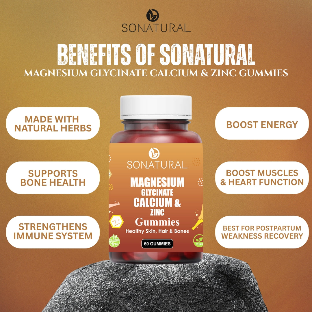 SoNatural Magnesium Glycinate Calcium & Zinc Gummies are formulated to provide essential minerals for overall health in one tasty chew. Magnesium, Calcium, and Zinc work together to strengthen bones, support muscle recovery, improve mood, and promote a healthy immune system. Perfect for anyone looking for an easy and enjoyable way to maintain daily wellness without pills or powders.